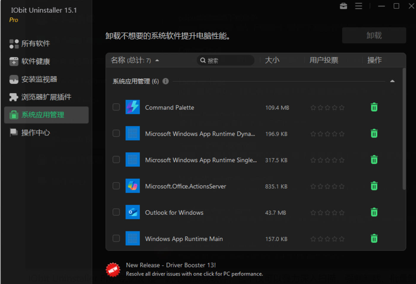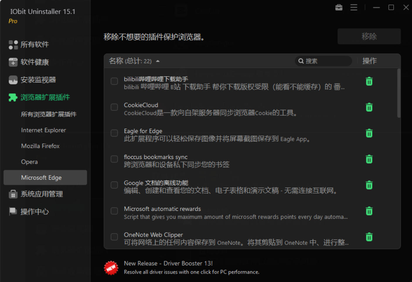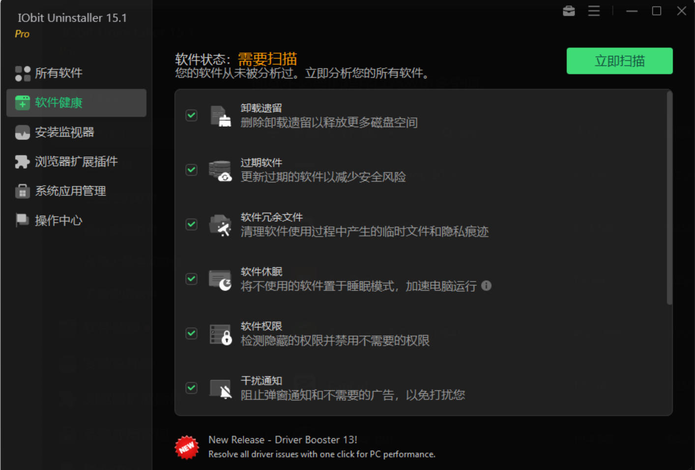IObit Uninstaller Pro 专业版 是一款电脑卸载软件,它不仅可以强力深入扫描,强制卸载、批量卸载各种软件,还能够清理注册表、Windows补丁缓存、移除浏览器工具栏和插件及控件。此外,它还能够解除文件的关联锁定,直接粉碎,功能纯粹又实用!